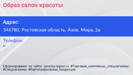 Образ, салон красоты по адресу 346780, Ростовская область, Азов, Мира, 2а в дальнейшем Организация, размещена в следующих категориях: