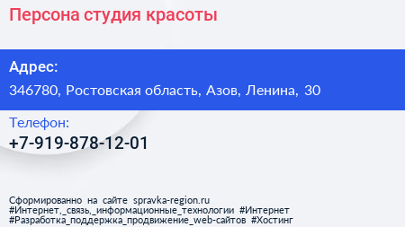 Персона, студия красоты по адресу 346780, Ростовская область, Азов, Ленина, 30 в дальнейшем Организация, размещена в следующих категориях: