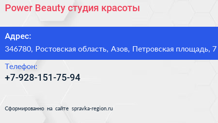 Power Beauty, студия красоты по адресу 346780, Ростовская область, Азов, Петровская площадь, 7 в дальнейшем Организация, размещена в следующих категориях: