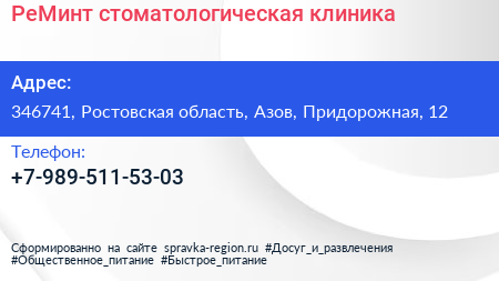 РеМинт, стоматологическая клиника по адресу 346741, Ростовская область, Азов, Придорожная, 12 в дальнейшем Организация, размещена в следующих категориях: