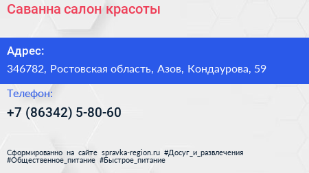 Саванна, салон красоты по адресу 346782, Ростовская область, Азов, Кондаурова, 59 в дальнейшем Организация, размещена в следующих категориях: