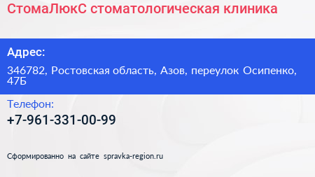 СтомаЛюкС, стоматологическая клиника по адресу 346782, Ростовская область, Азов, переулок Осипенко, 47Б в дальнейшем Организация, размещена в следующих категориях: