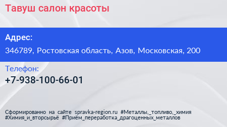 Тавуш, салон красоты по адресу 346789, Ростовская область, Азов, Московская, 200 в дальнейшем Организация, размещена в следующих категориях: