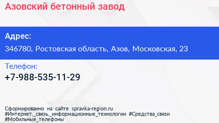 Азовский бетонный завод по адресу 346780, Ростовская область, Азов, Московская, 23 в дальнейшем Организация, размещена в следующих категориях: