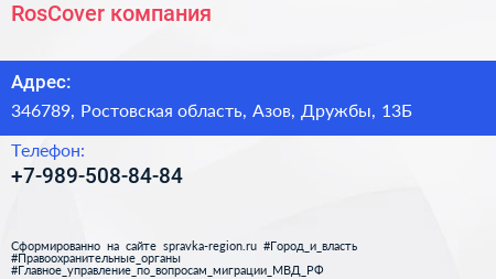 RosCover, компания по адресу 346789, Ростовская область, Азов, Дружбы, 13Б в дальнейшем Организация, размещена в следующих категориях:
