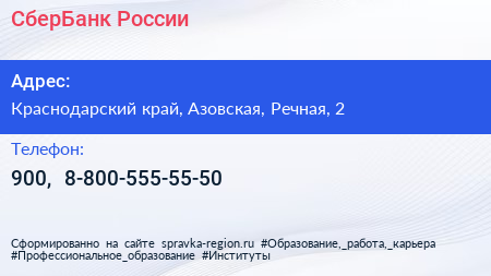 СберБанк России по адресу Краснодарский край, Азовская, Речная, 2 в дальнейшем Организация, размещена в следующих категориях: