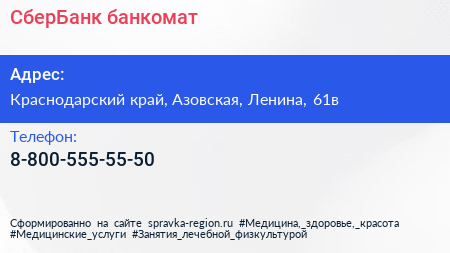 СберБанк, банкомат по адресу Краснодарский край, Азовская, Ленина, 61в в дальнейшем Организация, размещена в следующих категориях: