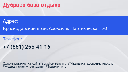 Дубрава, база отдыха по адресу Краснодарский край, Азовская, Партизанская, 70 в дальнейшем Организация, размещена в следующих категориях: