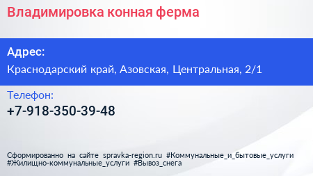 Владимировка, конная ферма по адресу Краснодарский край, Азовская, Центральная, 2/1 в дальнейшем Организация, размещена в следующих категориях: