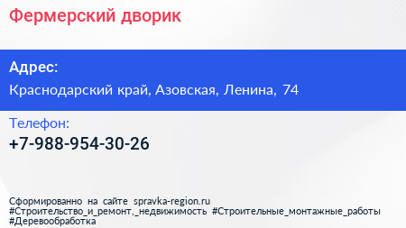 Фермерский дворик по адресу Краснодарский край, Азовская, Ленина, 74 в дальнейшем Организация, размещена в следующих категориях: