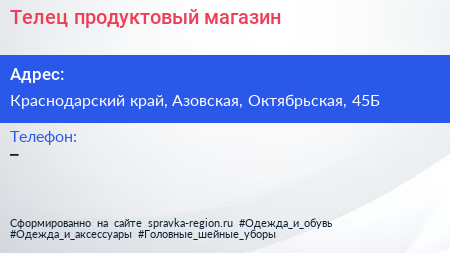 Телец, продуктовый магазин по адресу Краснодарский край, Азовская, Октябрьская, 45Б в дальнейшем Организация, размещена в следующих категориях: