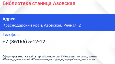 Библиотека, станица Азовская по адресу Краснодарский край, Азовская, Речная, 2 в дальнейшем Организация, размещена в следующих категориях: