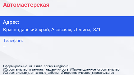 Автомастерская по адресу Краснодарский край, Азовская, Ленина, 3/1 в дальнейшем Организация, размещена в следующих категориях: