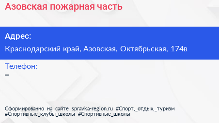 Азовская пожарная часть по адресу Краснодарский край, Азовская, Октябрьская, 174в в дальнейшем Организация, размещена в следующих категориях: