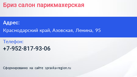 Бриз, салон-парикмахерская по адресу Краснодарский край, Азовская, Ленина, 95 в дальнейшем Организация, размещена в следующих категориях: