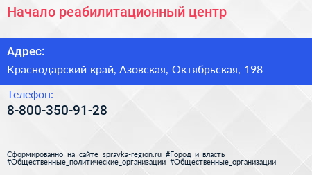 Начало, реабилитационный центр по адресу Краснодарский край, Азовская, Октябрьская, 198 в дальнейшем Организация, размещена в следующих категориях: