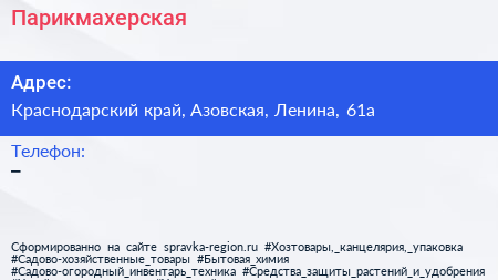 Парикмахерская по адресу Краснодарский край, Азовская, Ленина, 61а в дальнейшем Организация, размещена в следующих категориях: