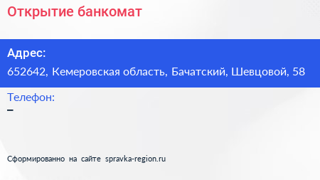 Открытие, банкомат по адресу 652642, Кемеровская область, Бачатский, Шевцовой, 58 в дальнейшем Организация, размещена в следующих категориях:
