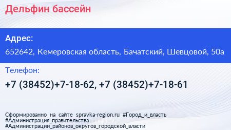Дельфин, бассейн по адресу 652642, Кемеровская область, Бачатский, Шевцовой, 50а в дальнейшем Организация, размещена в следующих категориях: