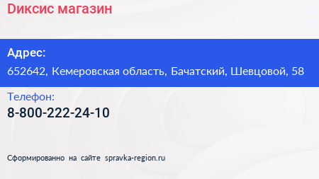 Dиксис, магазин по адресу 652642, Кемеровская область, Бачатский, Шевцовой, 58 в дальнейшем Организация, размещена в следующих категориях: