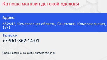 Катюша, магазин детской одежды по адресу 652642, Кемеровская область, Бачатский, Комсомольская, 19/1 в дальнейшем Организация, размещена в следующих категориях: