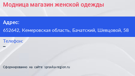 Модница, магазин женской одежды по адресу 652642, Кемеровская область, Бачатский, Шевцовой, 58 в дальнейшем Организация, размещена в следующих категориях: