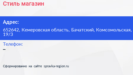 Стиль, магазин по адресу 652642, Кемеровская область, Бачатский, Комсомольская, 19/3 в дальнейшем Организация, размещена в следующих категориях: