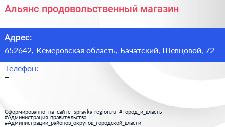 Альянс, продовольственный магазин по адресу 652642, Кемеровская область, Бачатский, Шевцовой, 72 в дальнейшем Организация, размещена в следующих категориях:
