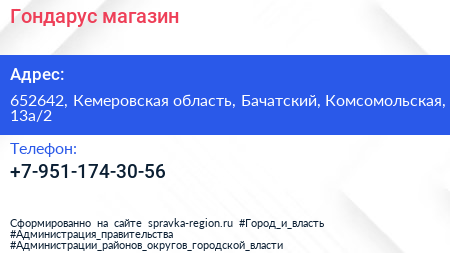 Гондарус, магазин по адресу 652642, Кемеровская область, Бачатский, Комсомольская, 13а/2 в дальнейшем Организация, размещена в следующих категориях: