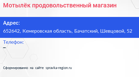 Мотылёк, продовольственный магазин по адресу 652642, Кемеровская область, Бачатский, Шевцовой, 52 в дальнейшем Организация, размещена в следующих категориях: