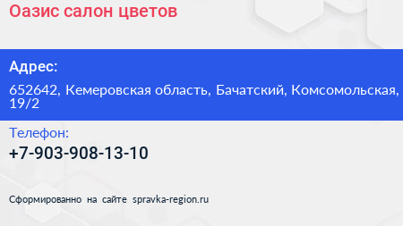 Оазис, салон цветов по адресу 652642, Кемеровская область, Бачатский, Комсомольская, 19/2 в дальнейшем Организация, размещена в следующих категориях:
