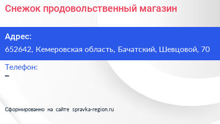 Снежок, продовольственный магазин по адресу 652642, Кемеровская область, Бачатский, Шевцовой, 70 в дальнейшем Организация, размещена в следующих категориях: