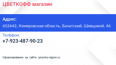 ЦВЕТКОФФ, магазин по адресу 652642, Кемеровская область, Бачатский, Шевцовой, 46 в дальнейшем Организация, размещена в следующих категориях: