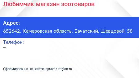 Любимчик, магазин зоотоваров по адресу 652642, Кемеровская область, Бачатский, Шевцовой, 58 в дальнейшем Организация, размещена в следующих категориях: