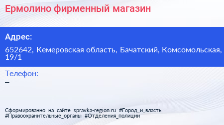 Ермолино, фирменный магазин по адресу 652642, Кемеровская область, Бачатский, Комсомольская, 19/1 в дальнейшем Организация, размещена в следующих категориях: