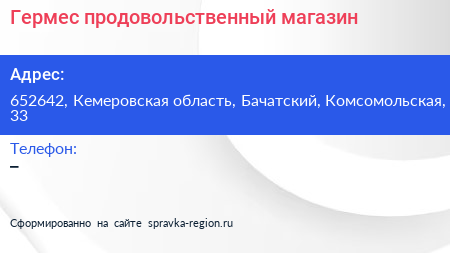 Гермес, продовольственный магазин по адресу 652642, Кемеровская область, Бачатский, Комсомольская, 33 в дальнейшем Организация, размещена в следующих категориях: