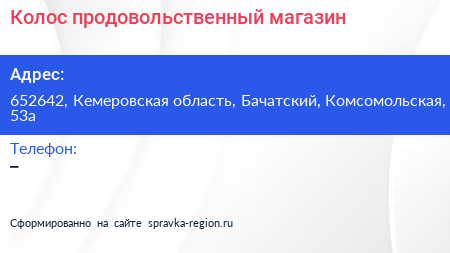 Колос, продовольственный магазин по адресу 652642, Кемеровская область, Бачатский, Комсомольская, 53а в дальнейшем Организация, размещена в следующих категориях: