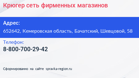 Крюгер, сеть фирменных магазинов по адресу 652642, Кемеровская область, Бачатский, Шевцовой, 58 в дальнейшем Организация, размещена в следующих категориях: