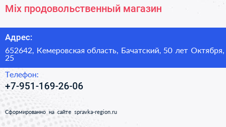 Mix, продовольственный магазин по адресу 652642, Кемеровская область, Бачатский, 50 лет Октября, 25 в дальнейшем Организация, размещена в следующих категориях: