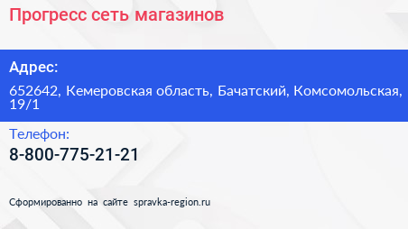 Прогресс, сеть магазинов по адресу 652642, Кемеровская область, Бачатский, Комсомольская, 19/1 в дальнейшем Организация, размещена в следующих категориях: