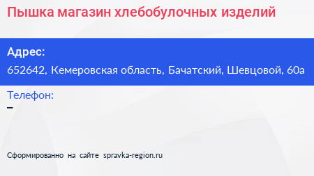 Пышка, магазин хлебобулочных изделий по адресу 652642, Кемеровская область, Бачатский, Шевцовой, 60а в дальнейшем Организация, размещена в следующих категориях: