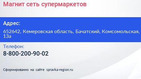 Магнит, сеть супермаркетов по адресу 652642, Кемеровская область, Бачатский, Комсомольская, 13а в дальнейшем Организация, размещена в следующих категориях: