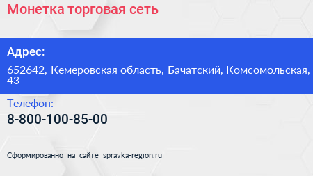 Монетка, торговая сеть по адресу 652642, Кемеровская область, Бачатский, Комсомольская, 43 в дальнейшем Организация, размещена в следующих категориях: