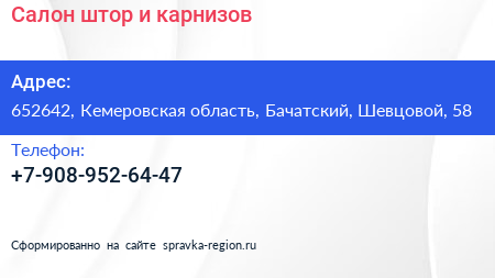 Салон штор и карнизов по адресу 652642, Кемеровская область, Бачатский, Шевцовой, 58 в дальнейшем Организация, размещена в следующих категориях:
