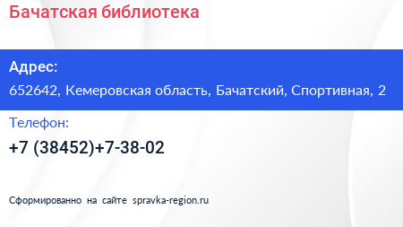 Бачатская библиотека по адресу 652642, Кемеровская область, Бачатский, Спортивная, 2 в дальнейшем Организация, размещена в следующих категориях: