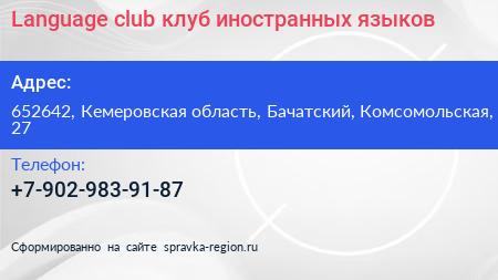 Language club, клуб иностранных языков по адресу 652642, Кемеровская область, Бачатский, Комсомольская, 27 в дальнейшем Организация, размещена в следующих категориях: