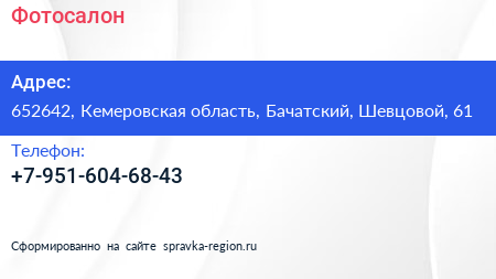 Фотосалон по адресу 652642, Кемеровская область, Бачатский, Шевцовой, 61 в дальнейшем Организация, размещена в следующих категориях: