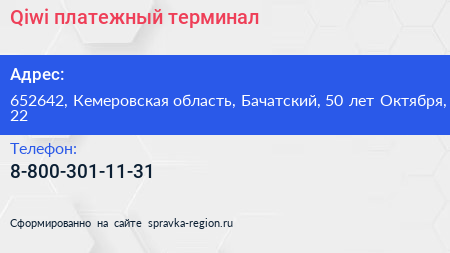 Qiwi, платежный терминал по адресу 652642, Кемеровская область, Бачатский, 50 лет Октября, 22 в дальнейшем Организация, размещена в следующих категориях: