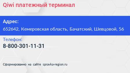 Qiwi, платежный терминал по адресу 652642, Кемеровская область, Бачатский, Шевцовой, 56 в дальнейшем Организация, размещена в следующих категориях: