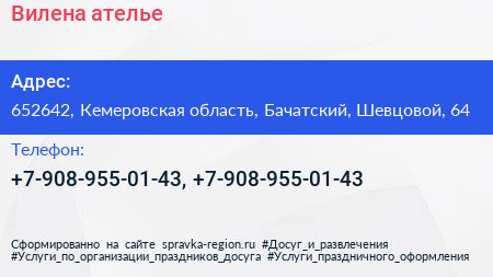Вилена, ателье по адресу 652642, Кемеровская область, Бачатский, Шевцовой, 64 в дальнейшем Организация, размещена в следующих категориях:
